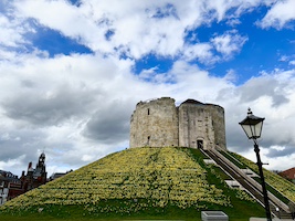 Next, upon the recommendation of our breakfast waitress, we went to the York Castle Museum on the site of York Castle - originally built by William the Conqueror in 1068. The museum itself was founded in 1938 and is housed in prison buildings which were built on the site of the castle in the 18th century, the debtors' prison (built in 1701-05 using stone from the ruins of the castle) and the female prison (built 1780-85). Many, many illuminating and, sometimes, disturbing displays across the facility, describing both the actual function of the building and reflecting on broader English life over the centuries. We looked at the daffodil-covered hill where the only remaining castle tower is open for touring and thought . . . Nah. Instead we had some coffee in the museum cafe and looked at others clambering up the hill.
