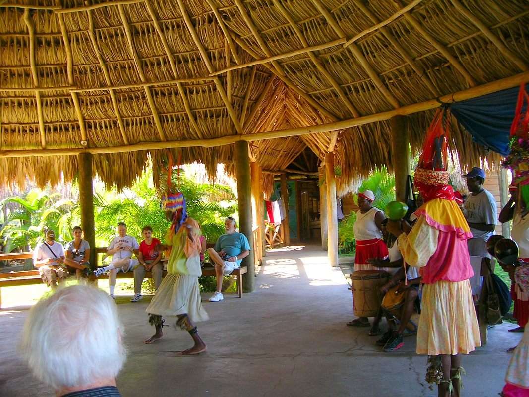 Our second stop was another hilltop spot, this time with huts large enough to allow a historic dance demonstration by a local Garifuna group. Descendants of Carib, Arawak, and West African peoples, they were involved in 18th-century wars between France and Great Britain. After surrendering to the British in 1796, a large number were deported. The local dance references a time when men were disguised as women in order to hide from these British who were, so the Garifuna say, on a mission to kill all males. We also enjoyed also a bread-making demonstration using cassava root. For all the world, the finished product tasted like baked potato chips.