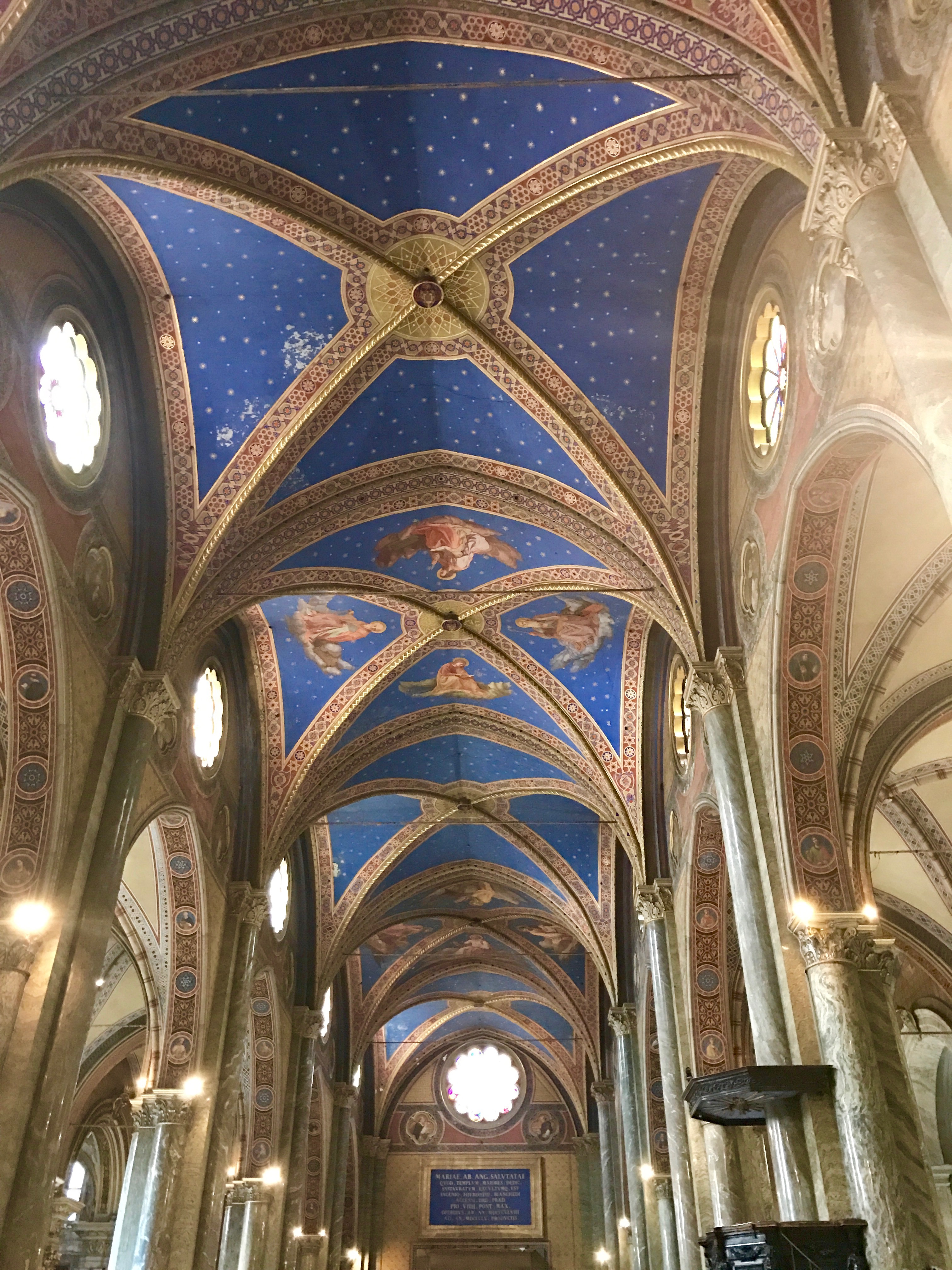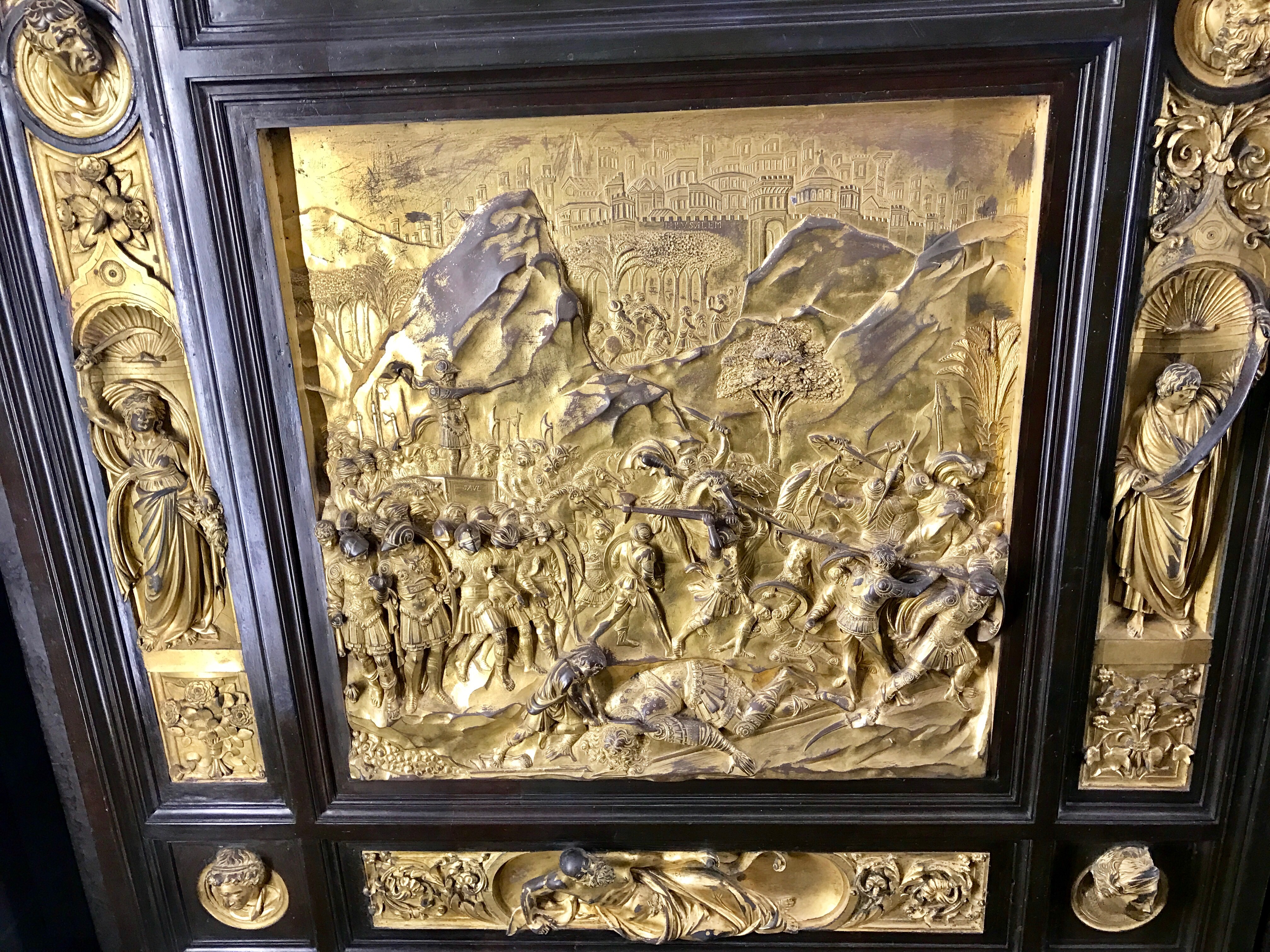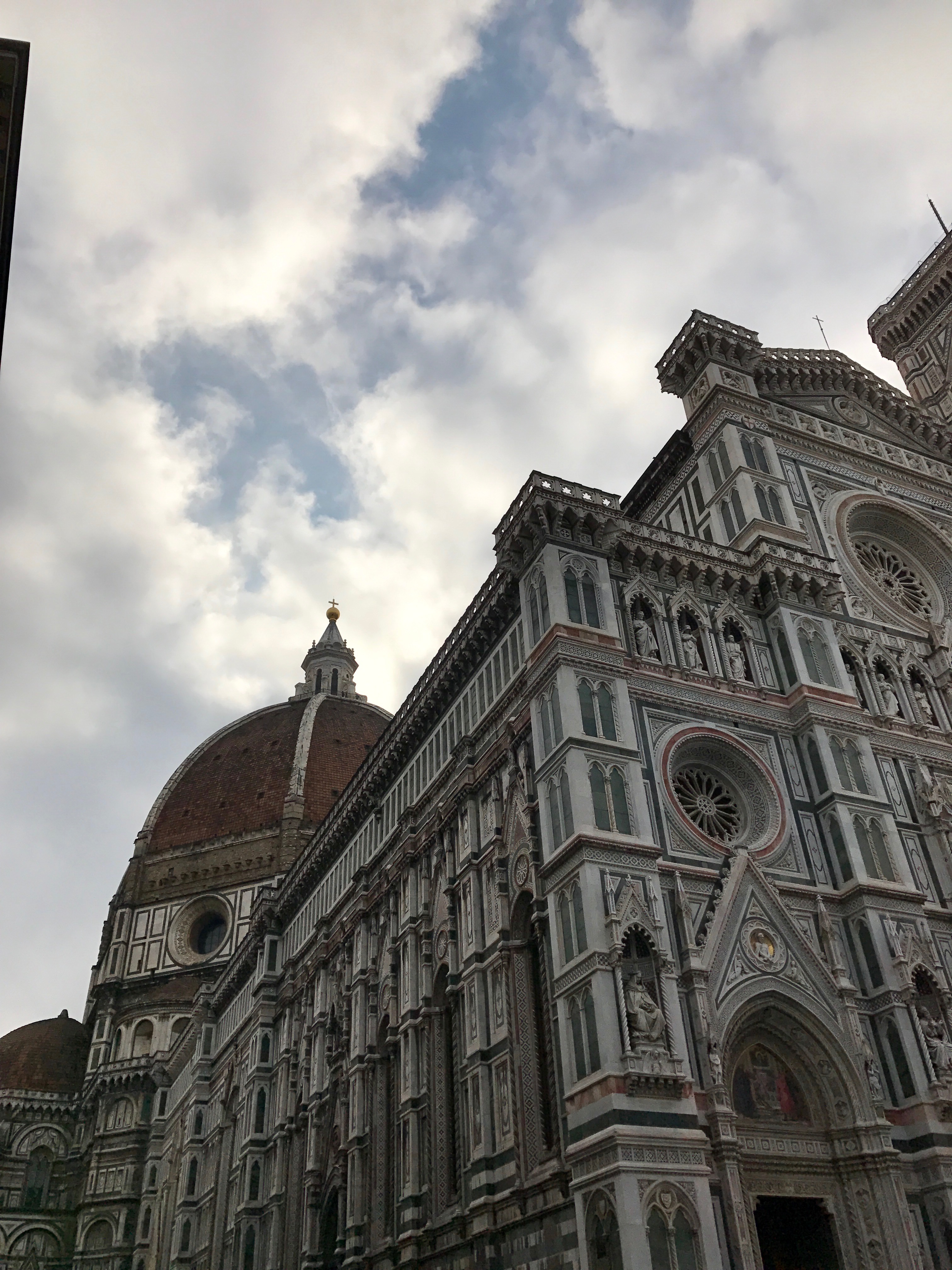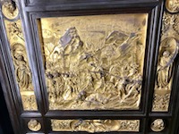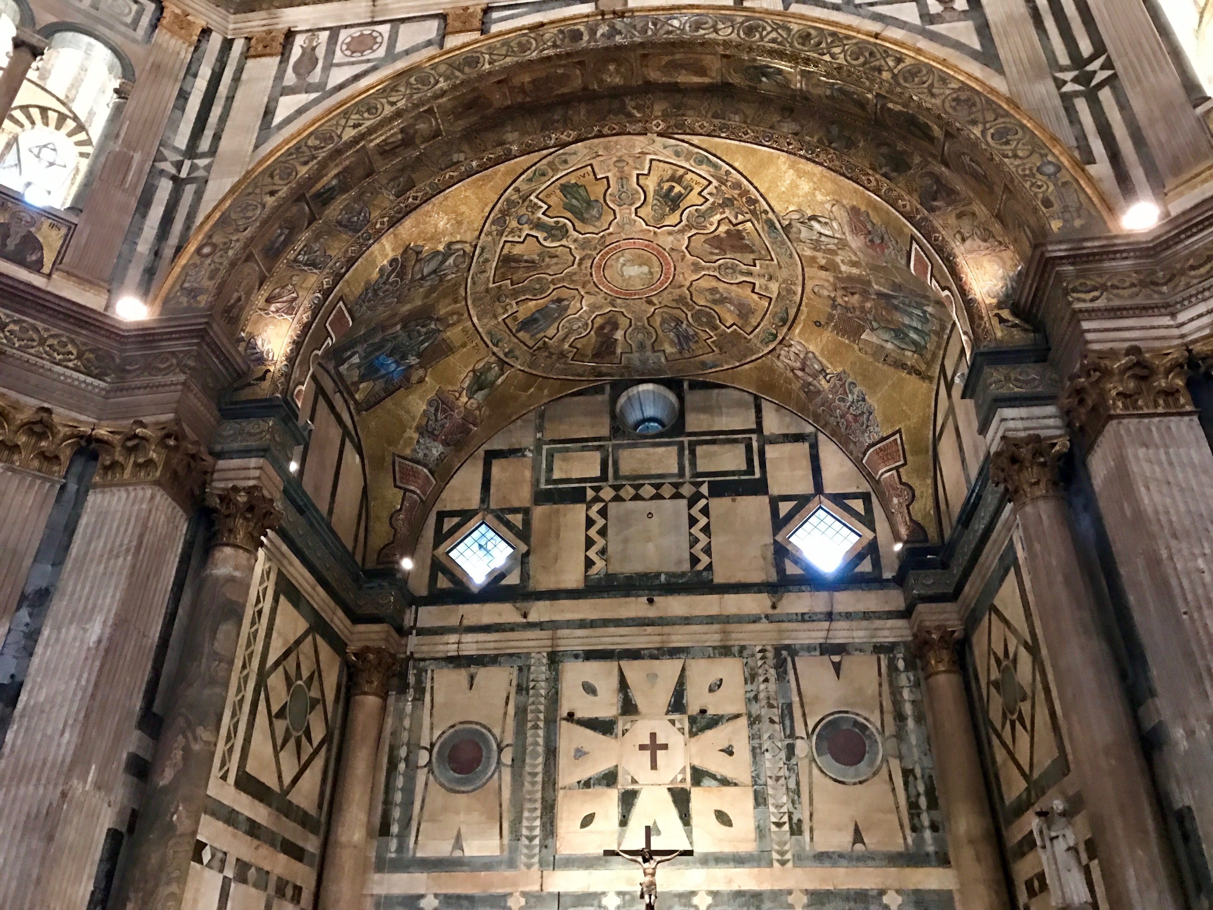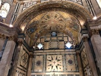 In 1966, the Arno River rose twenty feet and flooded the Duomo, damaging more than 6,000 volumes of documents and more than 50 illuminated manuscripts. Marisa descends into the crypt to look at archeological treasures, some uncovered during the renovation and restoration after the flood. Then up the tower steps with her pre-purchased ticket to get a better look at the Florentine vista. After a cappuccino break, we enter the Baptistry and gaze at the magnificent ceiling.