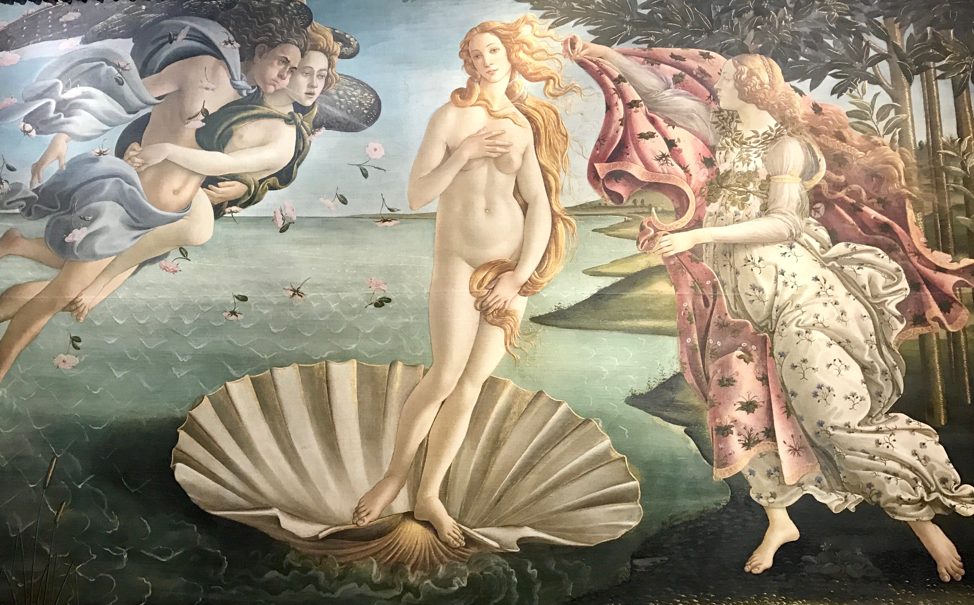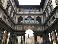 After a quick rest and some other bites on the street, we go to the Uffizi Gallery, passing all the people who did not get advanced tickets as Marisa did. Here are priceless works housed in the old offices (uffizi) of the Medici family. Cosimo the first Grand Duke planned to display his family's fine works of art and his descendants carried out the work. The last Medici heiress, Anna Maria Luisa, willed these pieces to Florence. Some sculptures went to the Bargello Museum, but the best of the best Renaissance paintings stayed in the office building.