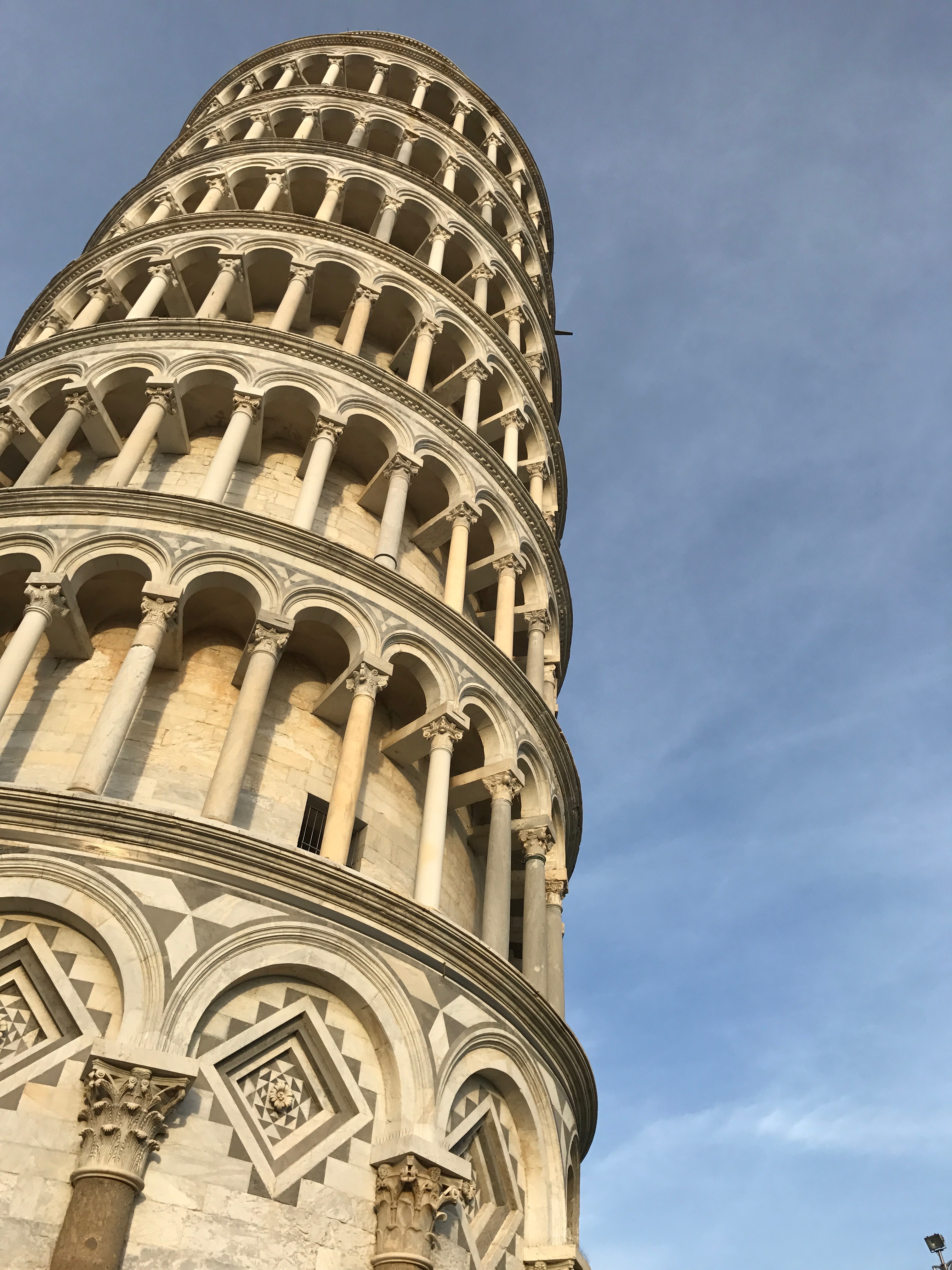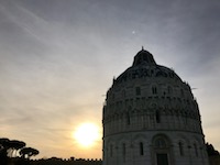 Pisa is our last stop, and it lives up to its mysterious fixation in the minds of all students of all ages. That tower. We have just under two hours here, but we really have no intention of waiting in line to walk up the crooked tower. (Truly, it doesn't just lean, it's crooked -- as if you'd stand a banana up on one end.) The sun is setting beautifully and the grass is emerald green. We walk into a corner bar looking out over the Field of Miracles and have a non-coffee drink. We ride back to Florence as the sun sets, full of appreciation for what we have experienced.