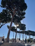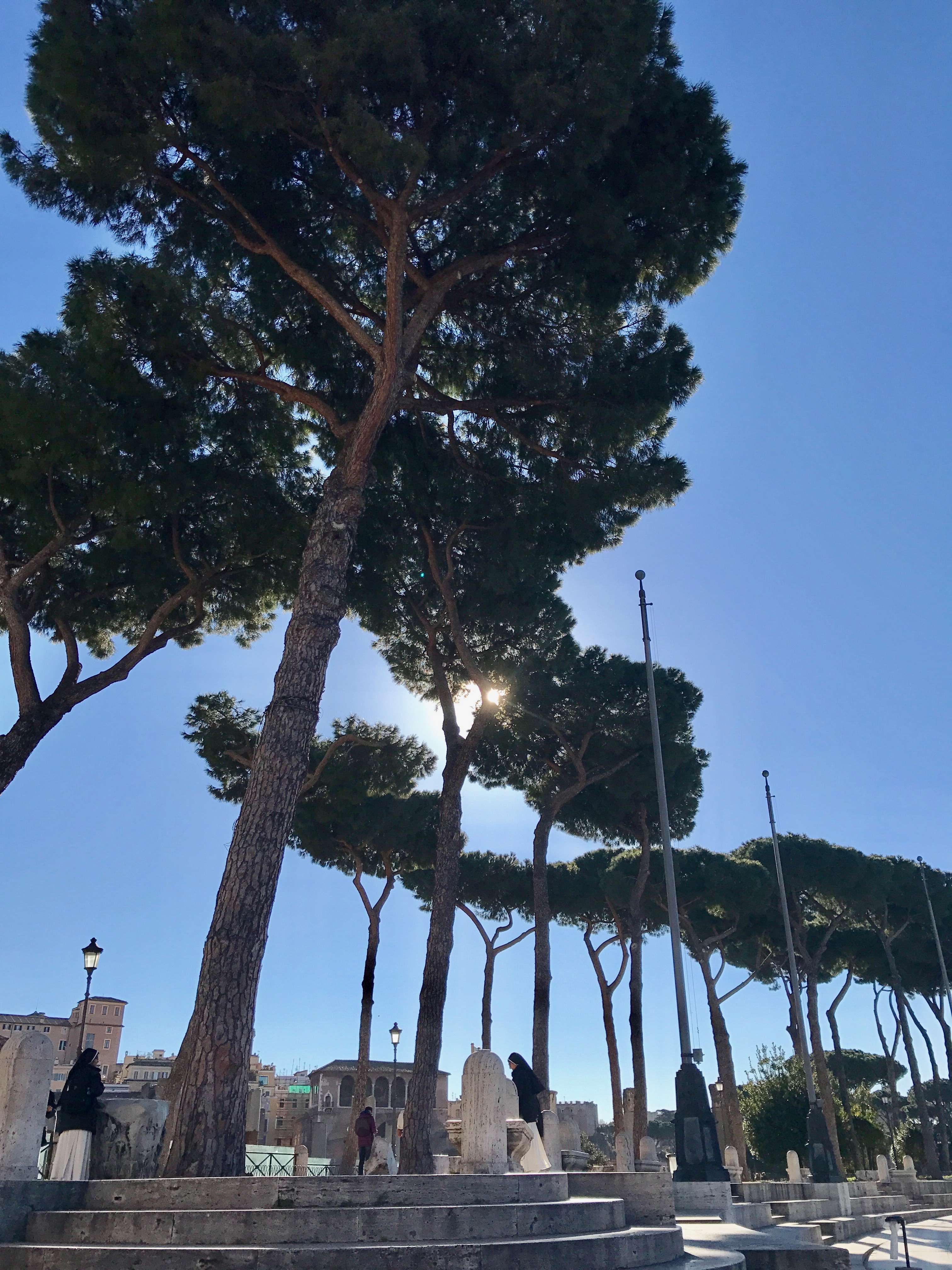 We walk on the mixture of large, ancient stones and smaller ones added over time, dodging bicycles and the occasional car, which we had read was banned from this stretch. We stop on rock remnants for rests and to look around, just being here. At one point, we have our picnic in the shade of the umbrella pines on this, yet another day of clear, blue skies.
