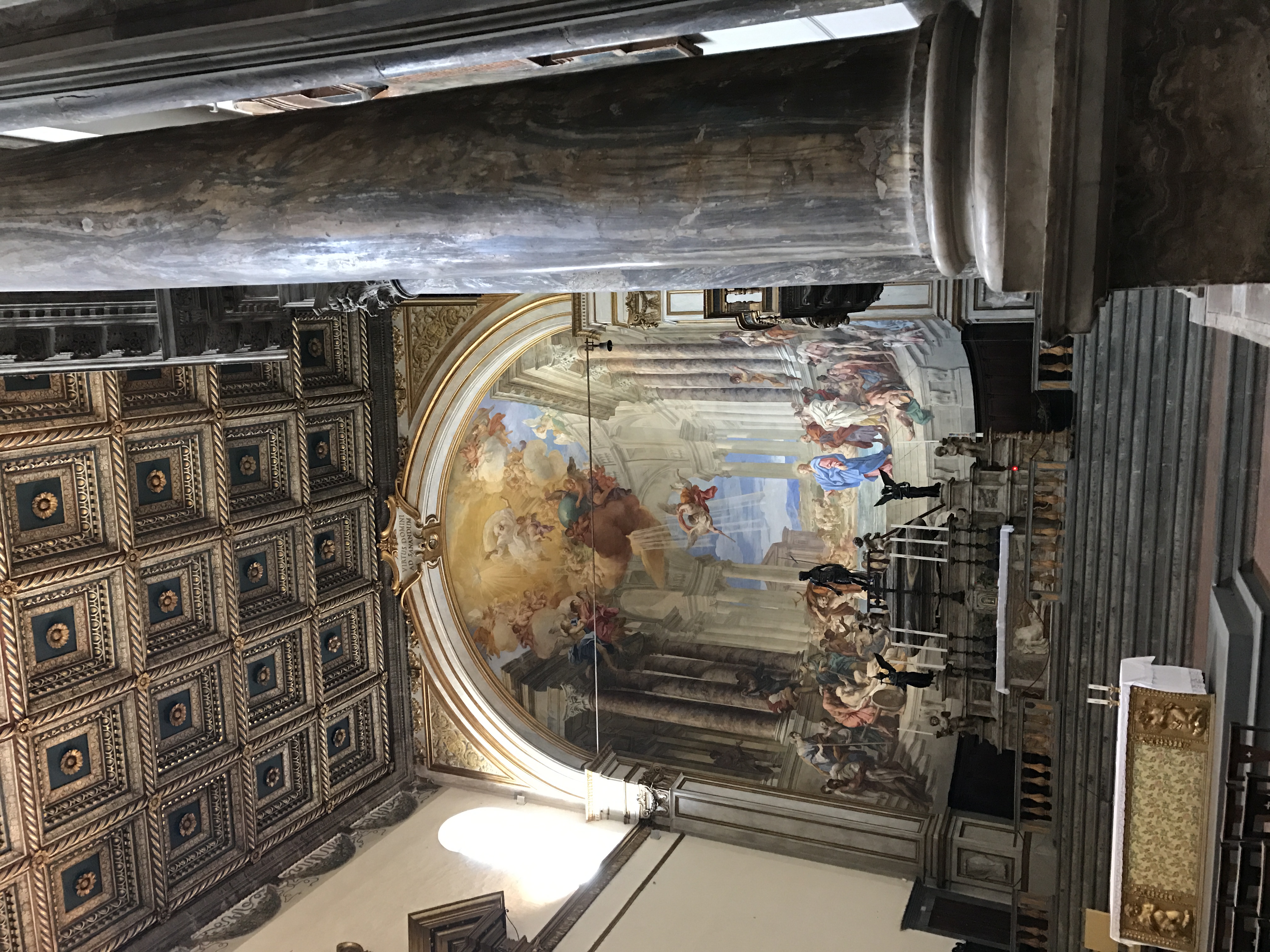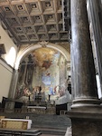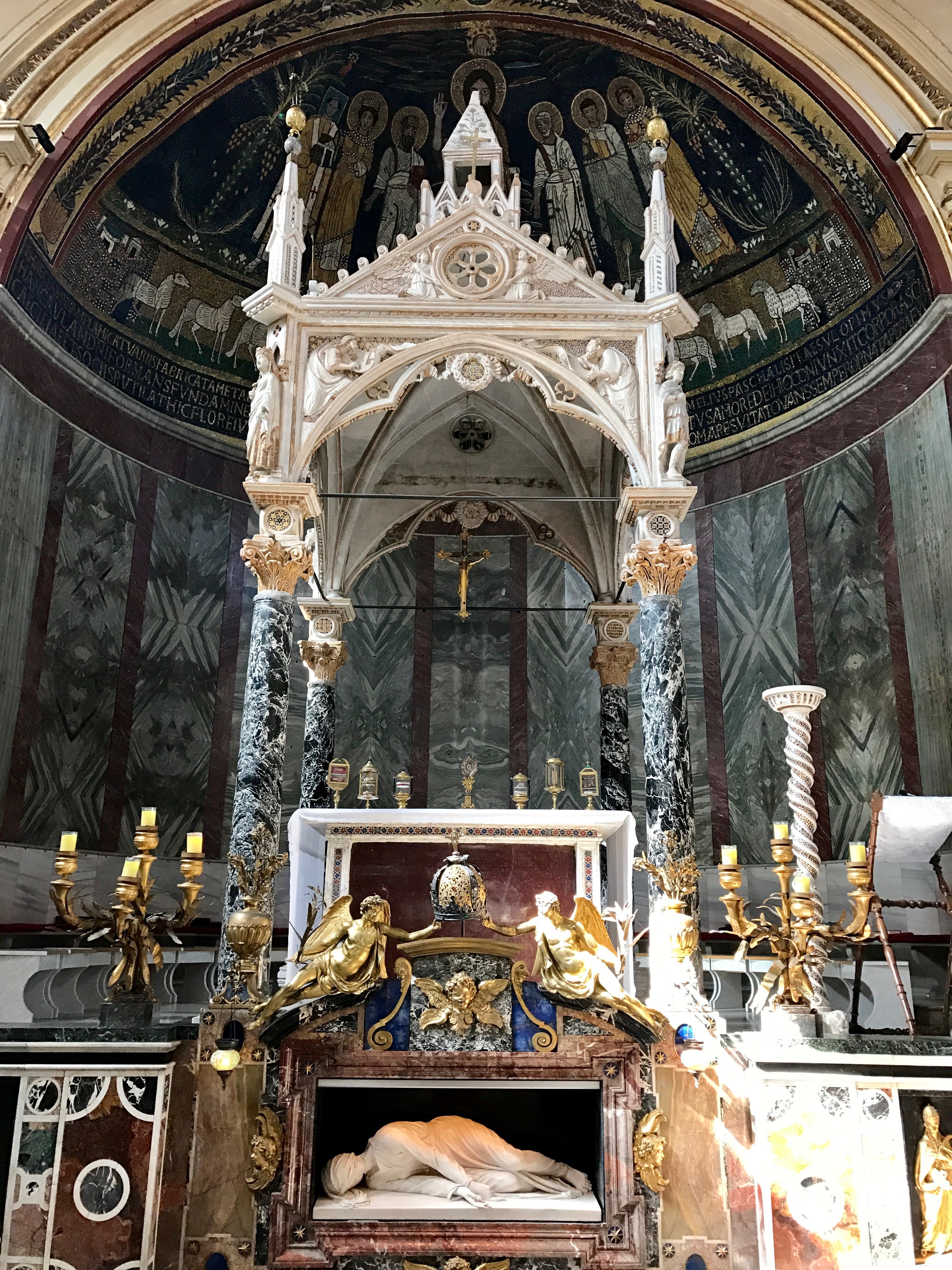 Across the river and into the Trastevere section of Rome, we visit some churches here, one with a Michelangelo sculpture censored with an added fig leaf, and one with St. Cecilia's statue in the base of the altar. Santa Cecilia in Trastevere is a fifth-century church built on the site of a third-century church that tradition says was built on the site of St. Cecilia's house. It's a beauty.