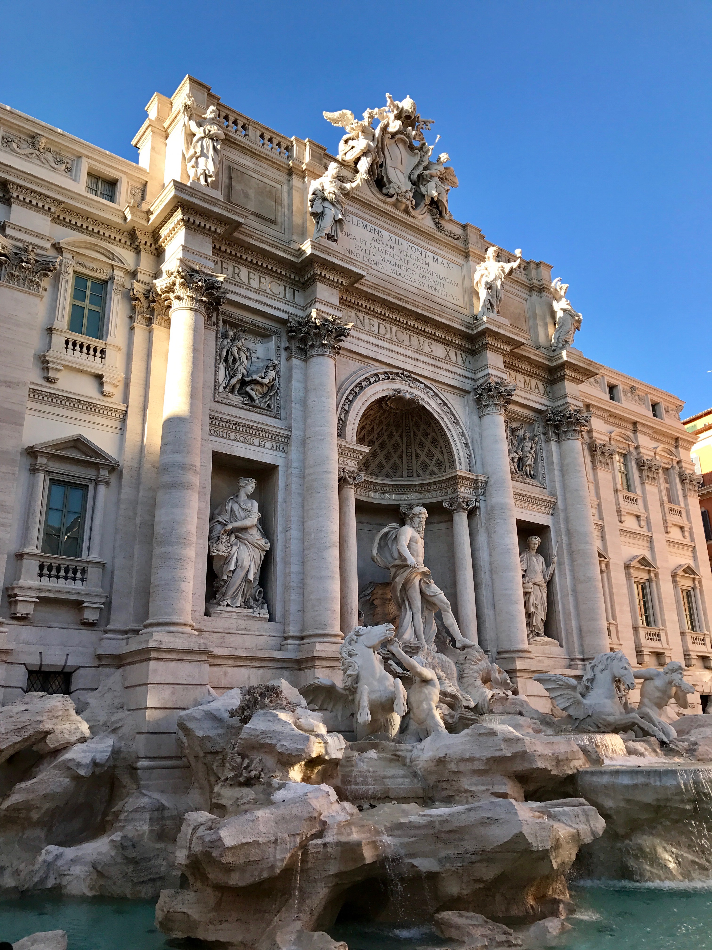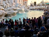 On our way back to the hotel, we easily walk by the Trevi Fountain, centerpiece of another piece of movie fluff: Three Coins in a Fountain. The fountain marked the ancient terminal point of three roads and an aqueduct that supplied water to ancient Rome. Now a Baroque riot in stone, it was finished in the seventeenth century and today serves as a coin magnet (3,000 Euros each day) for those who want to guarantee their return to Rome another day. We see huge, happy collections of visitors from all over the world, impossible to firmly distinguish one from another. This is a welcome mixing of strangers who appear, today, to have curiosity and cultural appreciation in common.