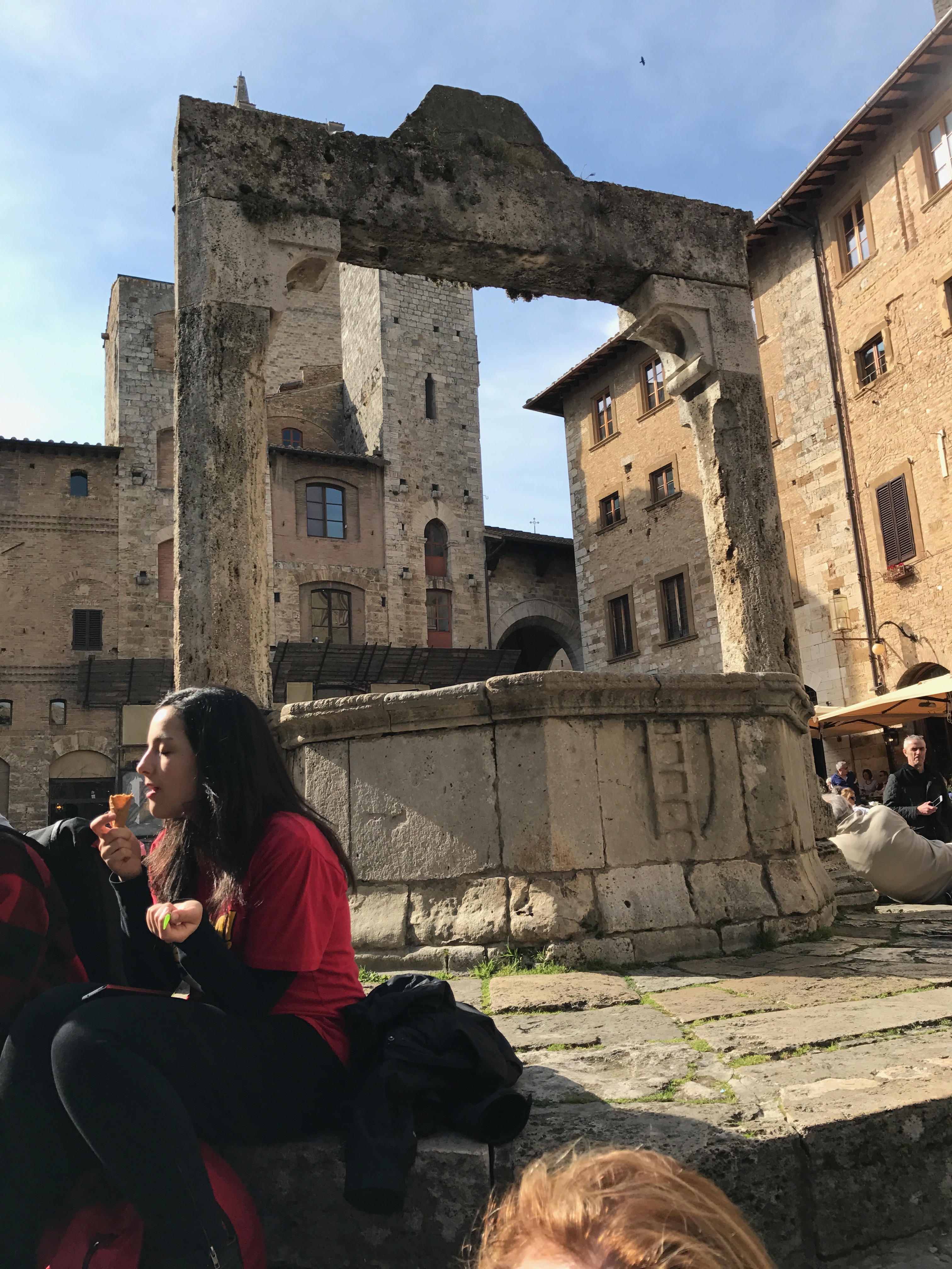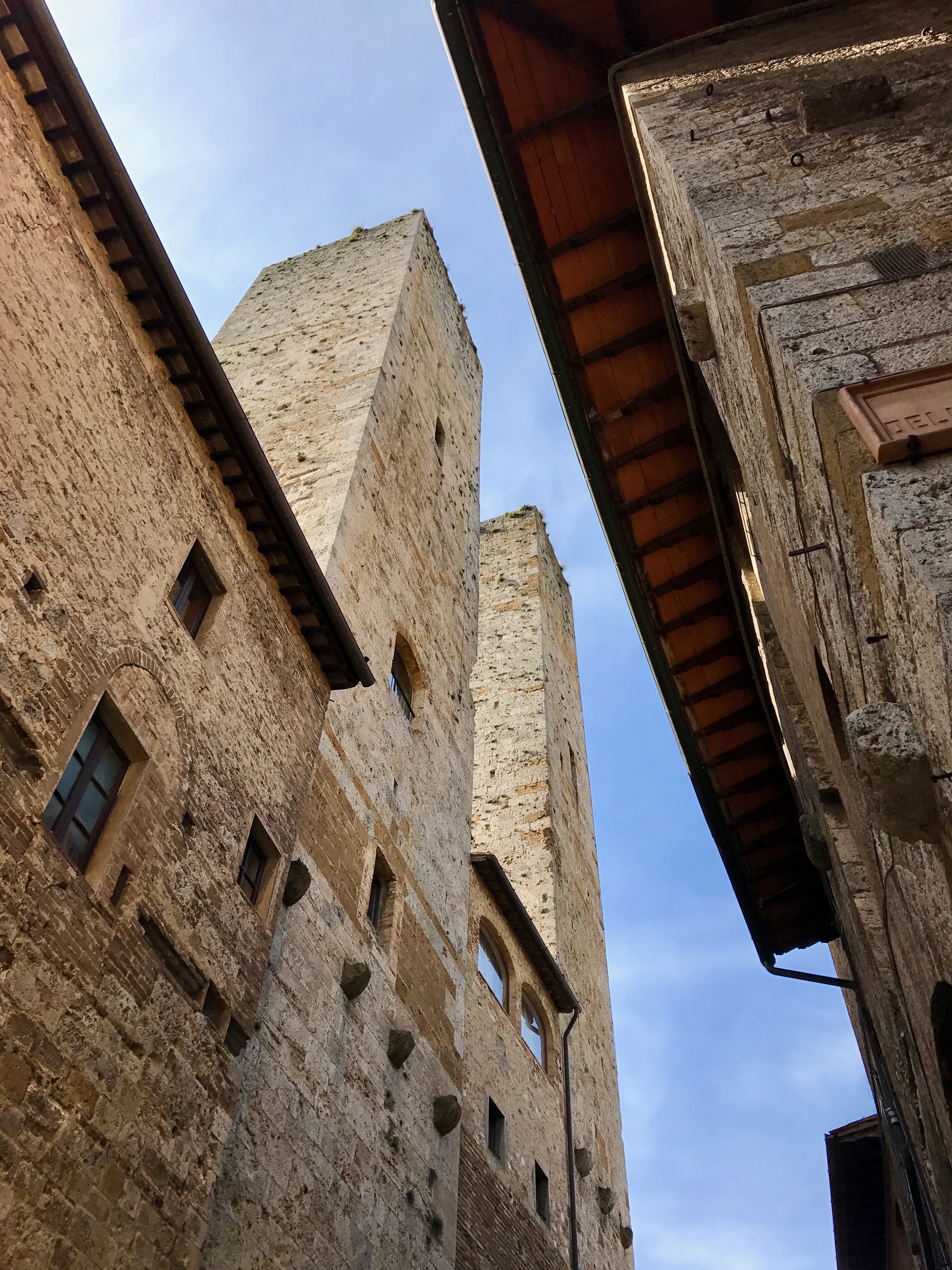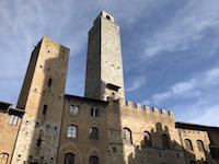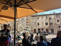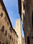 San G. ("san-jee"), as our guide calls her home town, is a medieval wonderland of towers and piazzas. We walk through the Porta San Giovanni at the southern end of the bouquet-shaped town and immediately begin to climb. And then immediately head into a porcelain shop for a Christmas ornament souvenir. Perhaps we were winded. So we climb again, this time up to the Piazza della Cisterna (a big fountain) and head to the place that won the prize for World's Best Gelato: the Gelateria Dondoli. It's good. We have a rosemary version and a vernaccia-flavored scoop. Vernaccia is the white wine grape most commonly associated with the San G. area and we had tasted a good bit of it during lunch...