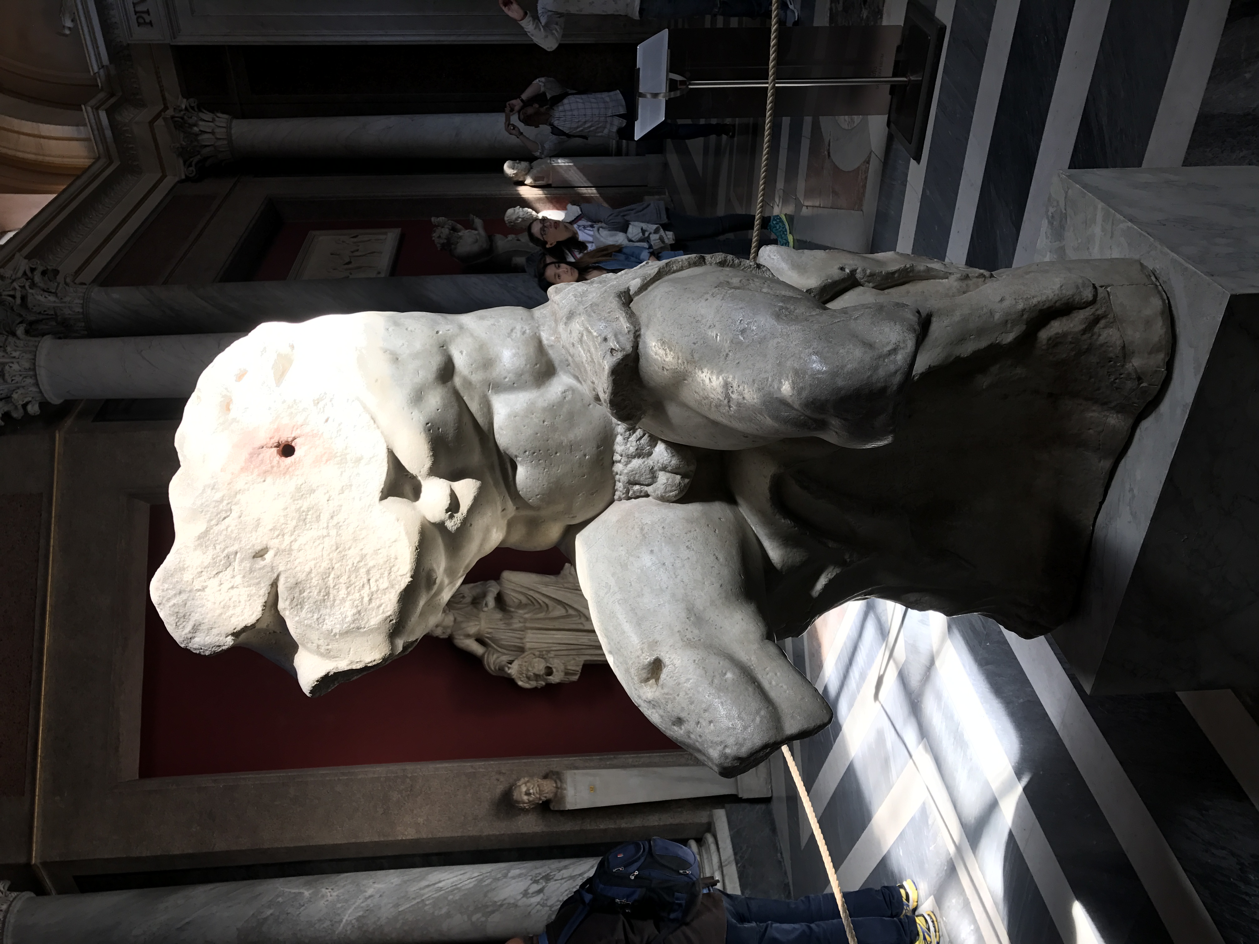 There are 54 galleries, 640 employees, and 20,000 (of the 70,000 works) on display. This is not for an afternoon. But planning ahead helps and we pick and choose our way among the rooms. Although many (most?) come to giggle at the fig leaves and stare at the ceiling, we spend a bit of time with the oldest sculptures. The Vatican Museums get their start with Pope Julius II (him again) who builds it around a sculpture of Laocoon and his Sons that had been discovered in a Roman vineyard in 1506. Michelangelo goes to examine the discovery and it's put on display a month later. Marisa's last visit to the Sistine Chapel was in 1982 when a good chunk of it was covered in scaffolding and the other pieces were sooty and dulled. It's something to behold. But the crowds are jostling, the elbows are poking, and the multilingual guides are shouting.