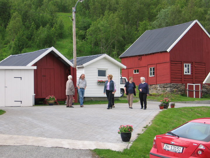 The Nerdal family is related to our mormorfar, Halvor Wiken, who emigrated as a young boy with the rest of his family from these western fjords in the late nineteenth century. Brit’s son, Jørgen Singsdal, and his eleven-year-old son, Thorfinn, met us at Nybö. We quickly dropped off our bags and headed to the Nerdal farm. Brit greeted us with smiles and hugs. (Only Damita and Kamin were strangers to her as Faye and Marisa had met her at her home on past trips; Faye had entertained Brit when she had traveled to the U.S. Midwest a few years before.) Her husband, Harald, and her daughter, Gunlaug, were there, along with daughter-in-law, Merethe, and her other two children: Ingeborg and Martin.