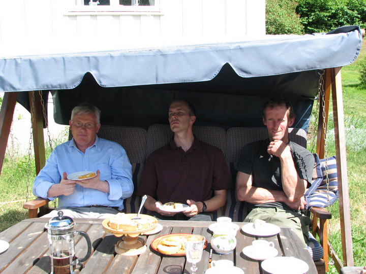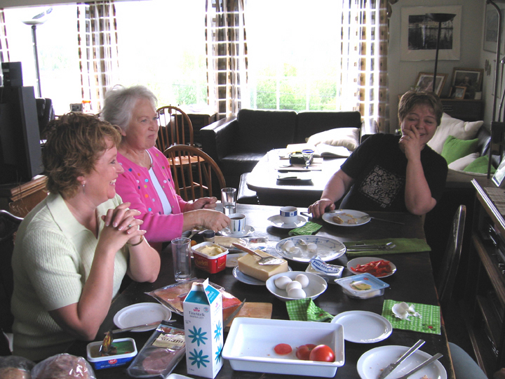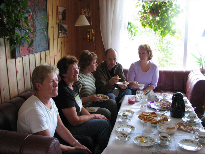 We sat down to an apple and sour cream cake, a chocolate cake, waffles with a cooked milk sauce (milk that has been cooked for eight hours until it turns a light chocolate brown.) A homemade jam made of raspberries picked from their place rounded out the mid-afternoon feast. All of us giggled over a story told by Erling’s wife. It seems she had Scottish visitors some time back and wanted to tell them to “help themselves” after being served afternoon coffee. Instead, she very carefully told them to “behave themselves.” Only after the puzzled looks her guests returned to her did she realize her linguistic mistake.