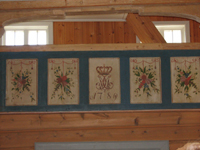 We again exchanged old photographs and family histories, then said goodbye to Tidemann before journeying to Ole Lunde’s farm for coffee. His was once one of the largest farms in the valley, though it has been split into smaller farms over the centuries. We sat under the trees on the spacious lawn and talked––over coffee and cake––about family histories and stories. It soon evolved (devolved?!) into a lively conversation about both Norwegian and American politics. Ole Lunde’s son was visiting, home from his studies in a Hungarian medical school. Nearly all of his classes there are in English, so he was also a great asset to our conversations as he dropped by the table occasionally. On this working farm, though, there were still chores to be done and he didn’t stay long. At Per Odd’s encouragement, we were led through the Lunde’s dining room: locally famous for its traditional Valdres furnishings.
