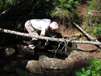 We then drove up the hill as close as possible to the remains of the Saelebote farm, where Torkel Anfinson (Ole’s father) was born. After leaving the cars, we took an enjoyable hike through the woods. The trail is nearly non-existent, and we meandered through the woods with Kamin and Birger in the lead, trying to puzzle out just exactly where the ruins are. Soon, we stood in the clearing next to the old well and the cowshed. (A picture from the Rollag Buskerud Bygdebok shows a picture of Saelebote as it was over one hundred years ago, as emigrants got ready to leave; we snapped a picture of ourselves from that same vantage point.)