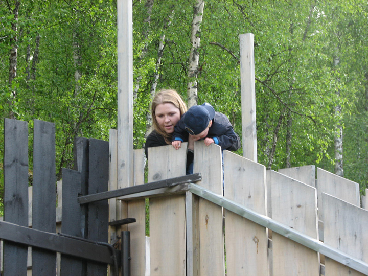 We left Bardufoss to go to Målselvfoss, voted Norway’s national waterfall in 2003 (foss = waterfall). We met up with Jørgen and Ann Harieth in the parking lot and all walked behind the tourist center and restaurant down to the falls where we were greeted by a breathtaking sight as the clouds parted for the sun once more. Jørgen paid the thirty kroner admission price for each of us to view the salmon underwater and to get a bit closer to the falls. At regular intervals, they open a door from the salmon “ladder” or “steps” built in 1910 on the side of the falls. As soon as a salmon gets in to this side box, they shut the door again. We stared through an acrylic window at this big guy––at least thirty inches long. Other visitors were there, enjoying picnics on the tables near the top of the falls. We took several pictures and wandered slowly back to our convoy of cars.