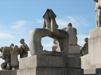 The hotel was a twenty-minute walk away, so we went back to rest up for just a few minutes with a smoothie and a coffee at a corner restaurant. Since this was Kamin’s last day in Norway, we felt compelled to work overtime, to see more on this first day. We headed in the other direction to Frogner Park to view the Vigeland sculptures, under nice weather being enjoyed by people everywhere – sunning on the lawns, swimming in the pool – tour groups from France and Japan being lectured about the park’s significant works of art. We strolled among the bronzes and the granites, then headed back.